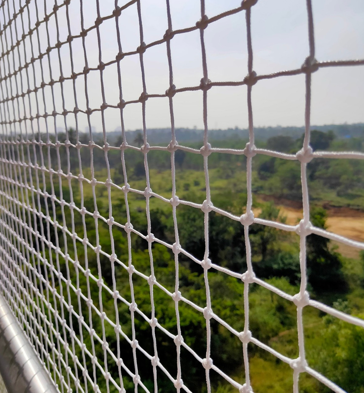Nets are made of knotted polyethylene (HDPE) hence is UV resistant. HDPE nets are chemically inert, water and weather proof. It has high breaking strength. Nets are fixed using stainless steel wire framework and hardwares. For Further specifications, the nets are fixed using wire rope, net bolts, screw pins, barrel strainers and hogging staples .This helps tight installation of nets that cannot be stretched, giving it a strong, clean & beautiful appearance.